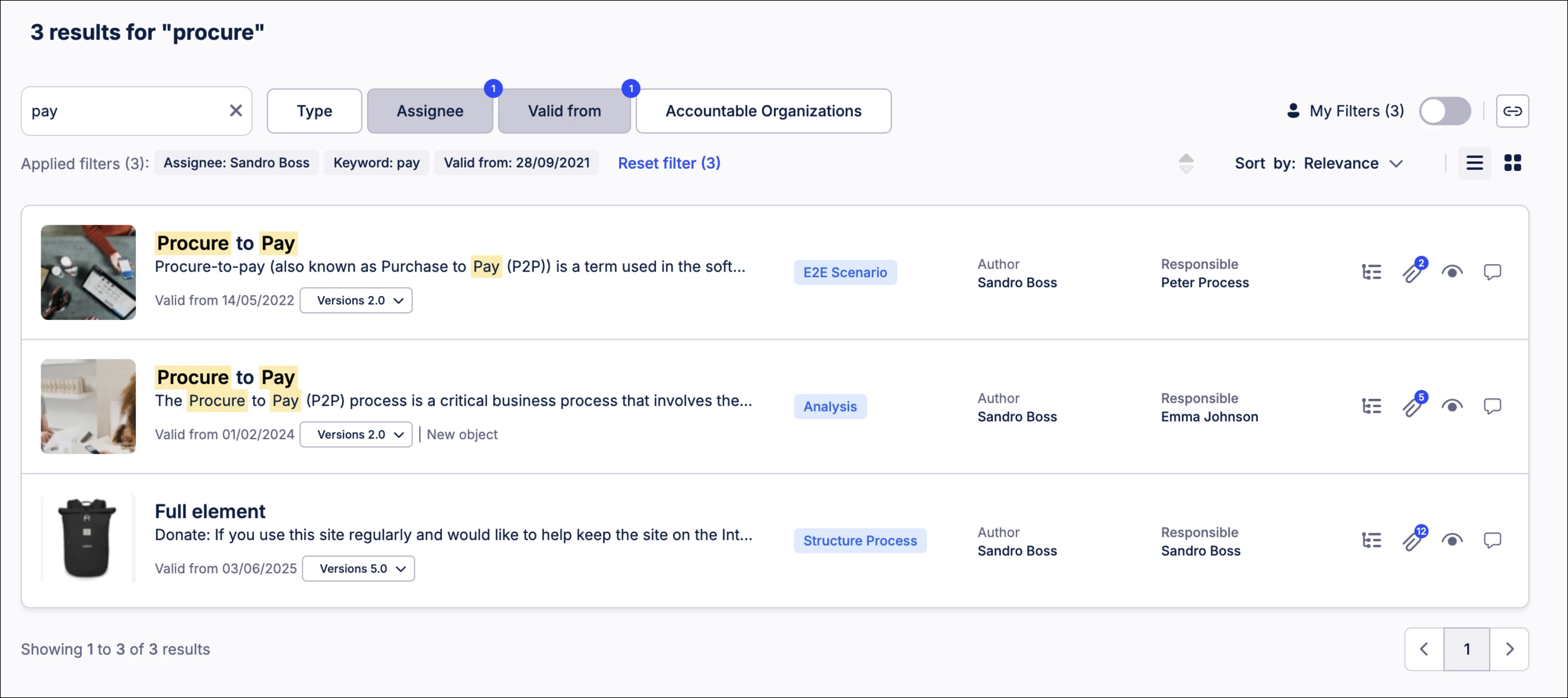 You can now search by keyword in Process Navigator as an additional filter to existing criteria. This helps you narrow down search results faster. We've also added a link in the Action Center to show where related content is found in Process Navigator.