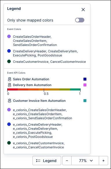 The process graph now includes a color legend to explain assigned color mappings in Process Explorer and Variant Explorer. A toggle also lets you gray out unmapped events to easily identify colored elements.
