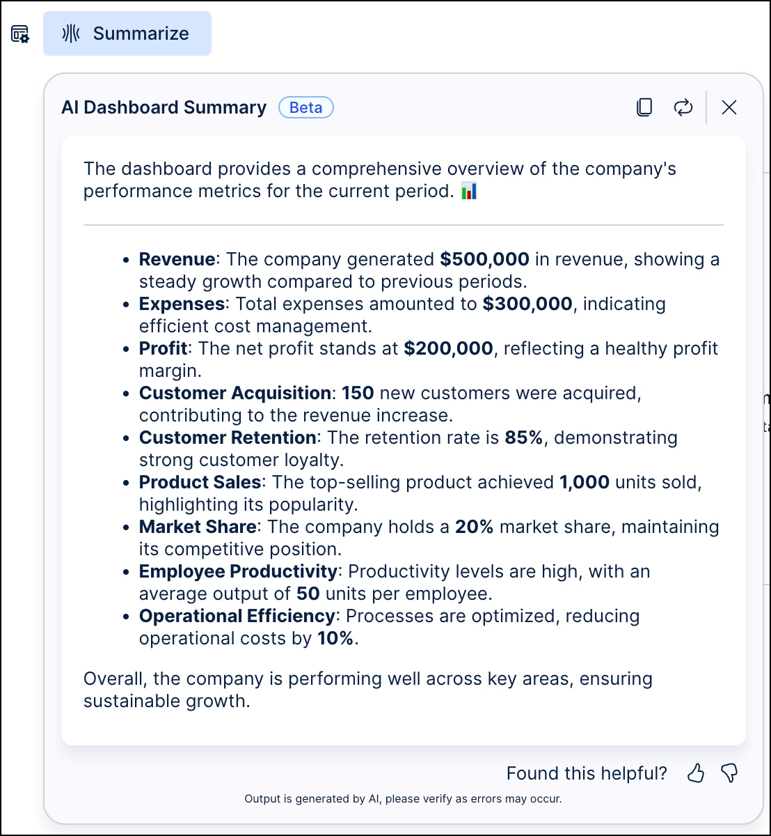 You can now enable an AI dashboard summary for published app users when creating or editing Studio Views. It analyzes app data to generate an executive overview on demand, helping with team onboarding and efficient insight copying.