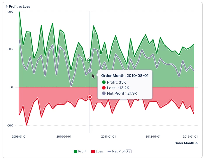 This allows you to configure an area chart for your Studio Views. This chart visualizes quantitative data across a continuous dimension (like time) by filling the area beneath a line to emphasize the size of the values, making trends and cumulative changes easier to see.